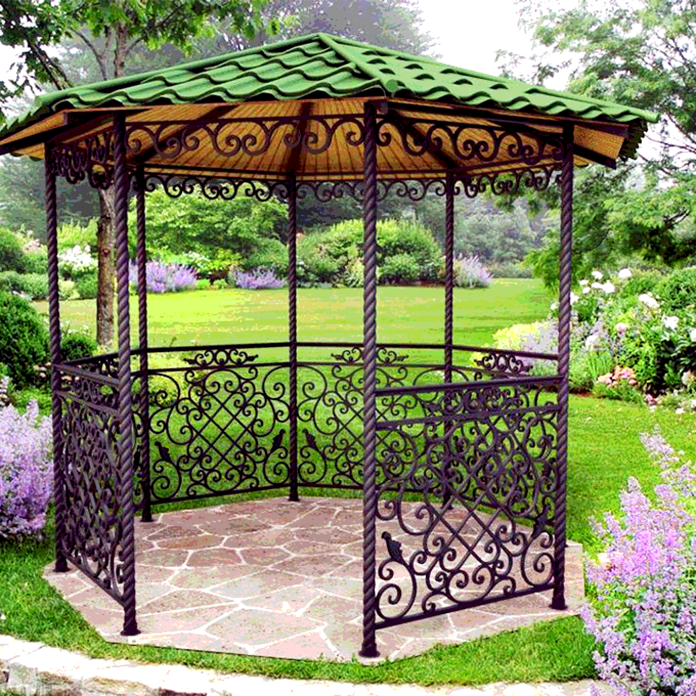 Кованые беседки нередко дополняют ландшафтный дизайн как частных владений, так и общественных мест. Качественно выполненная конструкция прекрасно выглядит как центральный элемент дачного участка. Сооружения используются для обустройства зон отдыха. Беседка, расположенная в саду и обвитая живыми растениями, позволяет насладиться природой и отлично защищает от ненастной погоды.
