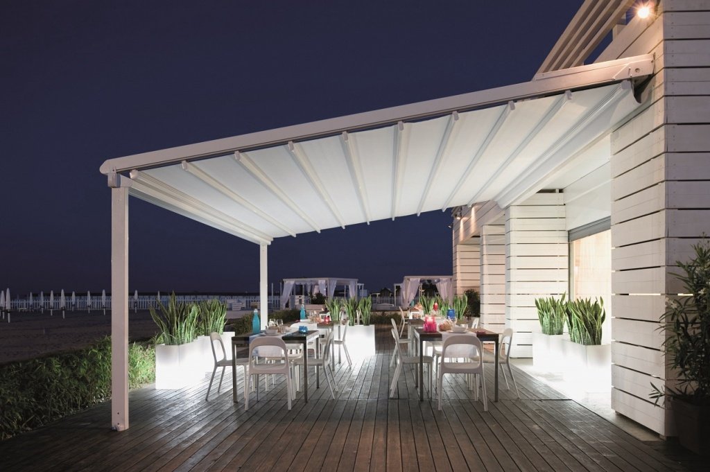 Это многофункциональная конструкция, которая прекрасно зонирует пространство и хорошо защищает от солнца и непогоды. Она интегрируется с основным зданием и имеет с ним одну общую стену. Обладает 6 классом ветроустойчивости и оборудуется раздвижной тентовой крышей и поворотными ламелями. Идеальный выбор для оформления террасы кафе.